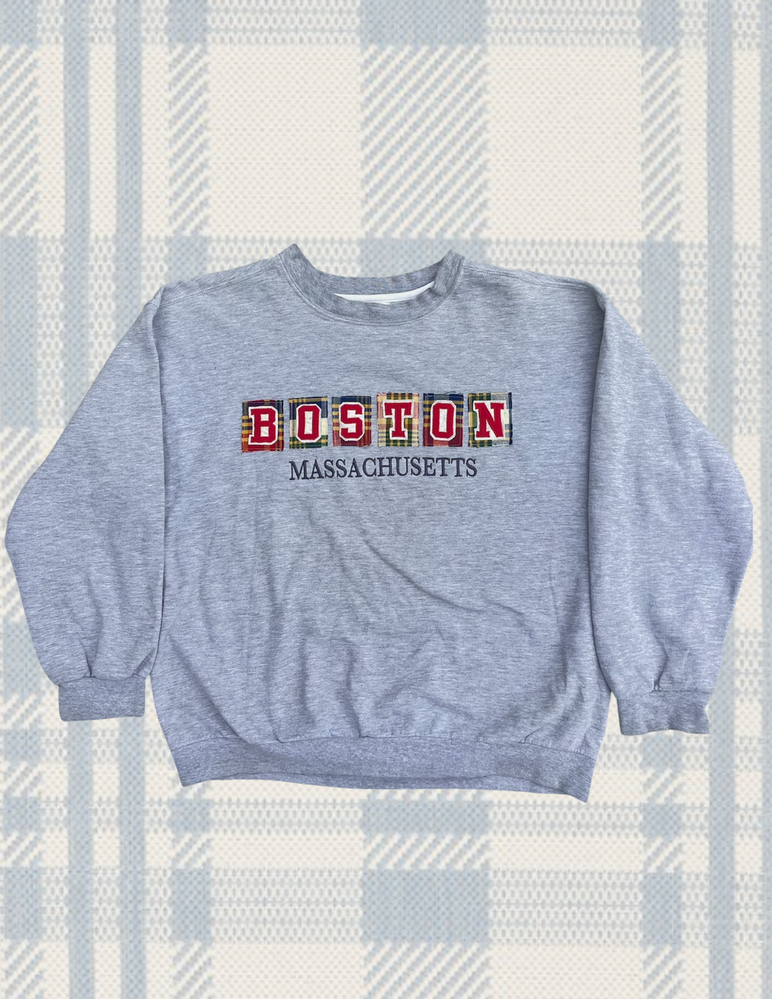 Show your Boston pride in this cozy, thrifted gray crewneck. It features hand-sewn patchwork in vibrant plaid and corduroy within the "BOSTON" lettering and embroidered Massachusetts beneath. A perfect blend of vintage comfort and customized New England style.