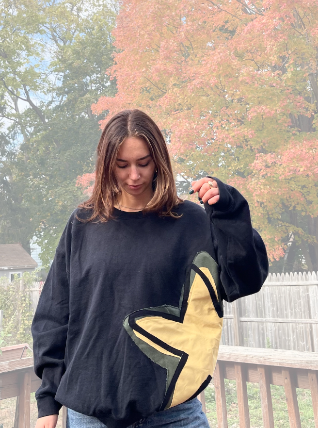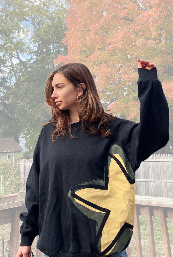 Represent your unique style with our signature ThreadsbyG Star logo crewneck, a truly one-of-a-kind piece born from sustainable fashion. This cozy black crewneck sweatshirt has been carefully upcycled and thrifted, then transformed with a bold, hand-patchworked rendition of the iconic threads by G star logo.